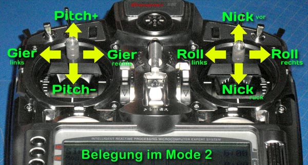 Die gebräuchlichste Senderbelegung fürs Helifliegen ist Mode 2. D.h. Gas (Pitch) ist auf dem linken Stick. Eingefleischte Umsteiger von Flächenflieger haben Roll auch mal links (Mode 1)